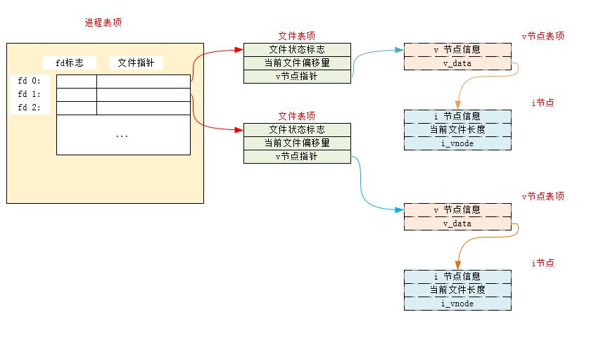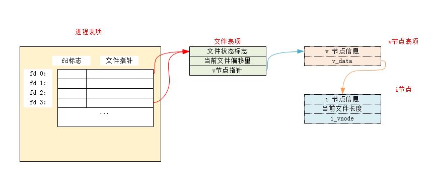 注意:- 可能有多个文件描述符指向同一文件表项,请见dup函数和