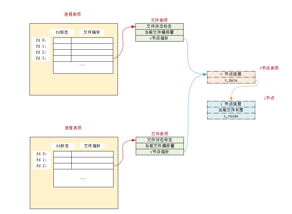 进程A和B都有自己的文件表项,这是因为这样可以使每个进程都有它自己的对该文件的当前偏移量。