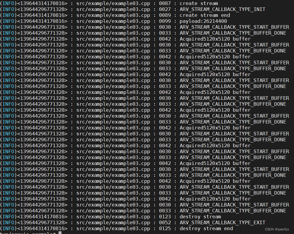 /* Retrieve the payload size for buffer creation */ //从相机对象中获取图像负载大小(每个图像的字节大小) payload = arv_camera_get_payload (camera, &error); PAW_INFO("payload:" << payload); if (error == NULL) { /* Insert some buffers in the stream buffer pool */ //双缓冲 for (i = 0; i < 2; i++) arv_stream_push_buffer (callback_data.stream, arv_buffer_new (payload, NULL)); }