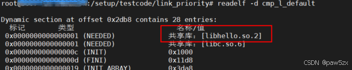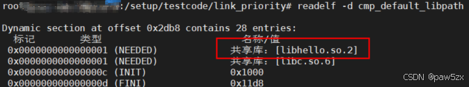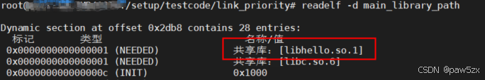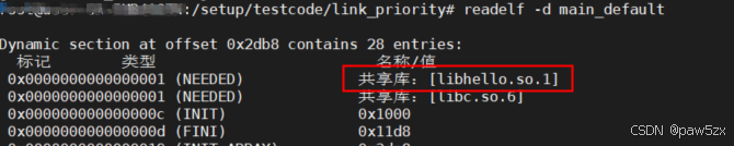 然后使用readelf -d查看可执行文件的动态段信息,可见链接成功,并且链接的是默认路径下的共享库文件libhello.so.2.1.0(其soname为libhello.so.2)。因此可以得出结论:默认路径搜索优先级要高于LIBRARY_PATH指定的路径的搜索优先级。