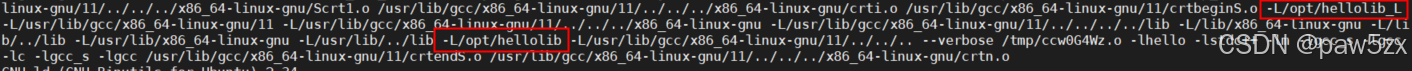 可见链接器先是搜索我们使用-L指定的路径/opt/hellolib_L,然后搜索编译器配置的路径/usr/lib/gcc/x86_64-linux-gnu/11/../../../../lib/(其本质就是默认路径/usr/lib/),最后搜索LIBRARY_PATH指定的路径/opt/hellolib。证明了编译过程中链接时库搜索路径的优先级为