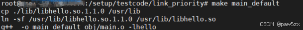 将libhello.so.1.1.0拷贝至默认搜索路径/usr/lib,并在/usr/lib下创建一个软链接(libhello.so)指向它,然后进行链接操作,查看是否可以将main.o和hello的共享库文件链接成功。