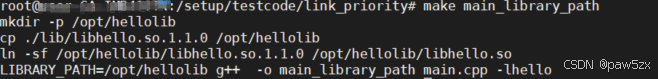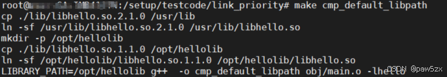创建路径/opt/hellolib,将libhello.so.1.1.0拷贝至/opt/hellolib,并在/opt/hellolib下创建一个软链接(libhello.so)指向它。然后将/opt/hellolib添加至LIBRARY_PATH并进行main.o和hello的共享库文件的链接操作,查看是否可以链接成功。