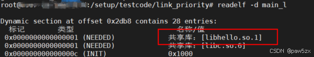 然后使用readelf -d查看可执行文件的动态段信息,可见链接成功,并且链接的是-L指定路径下的共享库文件libhello.so.2.1.0(其soname为libhello.so.2)。因此可以得出结论:-L指定路径搜索优先级要高于默认搜索路径的搜索优先级。