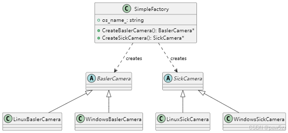 | class SimpleFactory { public: BaslerCamera* CreateBaslerCamera() { if ("Linux" == os_name_) { return new LinuxBaslerCamera(); } else if ("Windows" == os_name_) { return new WindowsBaslerCamera(); } else { return nullptr; } }