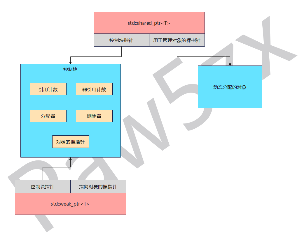 首先我们要知道,当创建一个std::shared_ptr指向某个对象时,会生成一个控制块来存储该对象的引用计数和其他管理信息。如果基于这个std::shared_ptr再创建一个或多个std::weak_ptr,那么这些std::weak_ptr将也指向这个控制块。